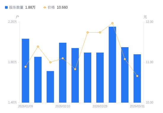 4月2日消息,数据显示,截至2026年3月31日,汇金通A股股东总户数为1.88万户,较上期(2026年3月20日)减少705户,降幅3.62%。公司最新A股总股本为3.39亿股,其中流通A股3.39亿股,户均持有流通A股数量为1.8万股,较上期增加652.3股,增幅3.75%;户均持流通A股市值19.23万元,较上期减少350.69元,降幅0.18%。