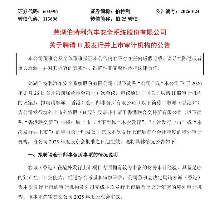 来自安徽芜湖的A股上市公司伯特利(603596.SH)于周五(3月27日)发布公告称,公司同意聘请容诚(香港)会计师事务所有限公司为公司境外发行H股股票并在香港联合交易所有限公司主板挂牌上市的审计机构。该议案尚需提交公司股东会审议。