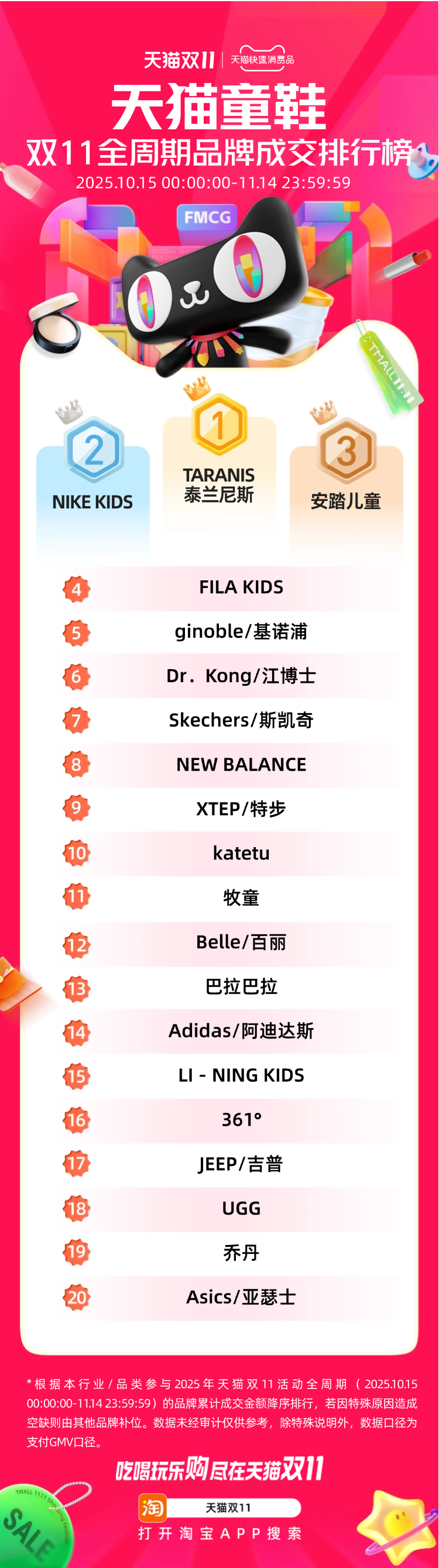 2025年双十一购物狂欢季圆满收官,泰兰尼斯以绝对优势斩获天猫童鞋品牌成交榜第一、天猫童鞋品牌店铺成交榜第一、京东平台童装童鞋榜第一,实现“多平台全满贯”,创下品牌双十一最佳战绩,再次印证其在高端童鞋赛道的领军地位。