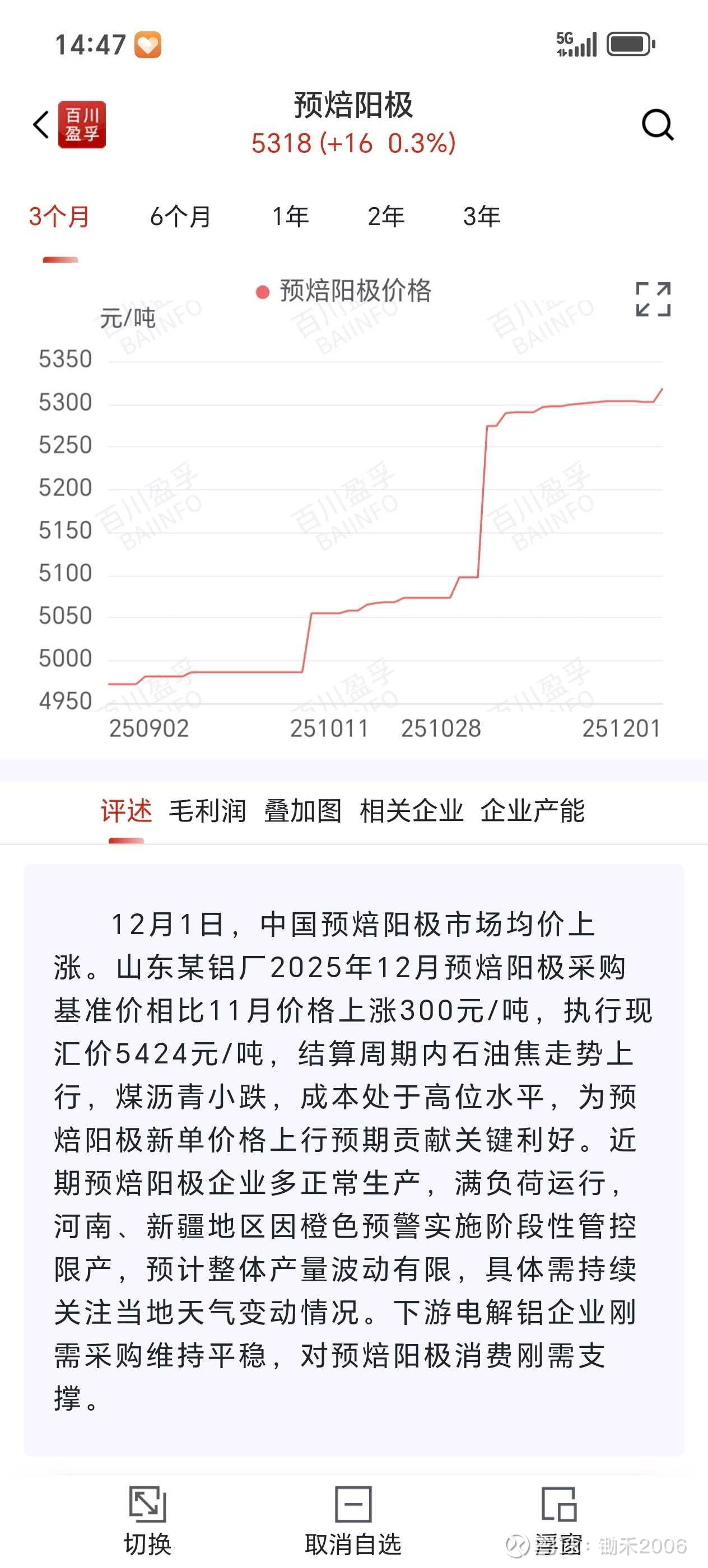 预焙阳极今年价格上涨了43%,今天大涨近6%。