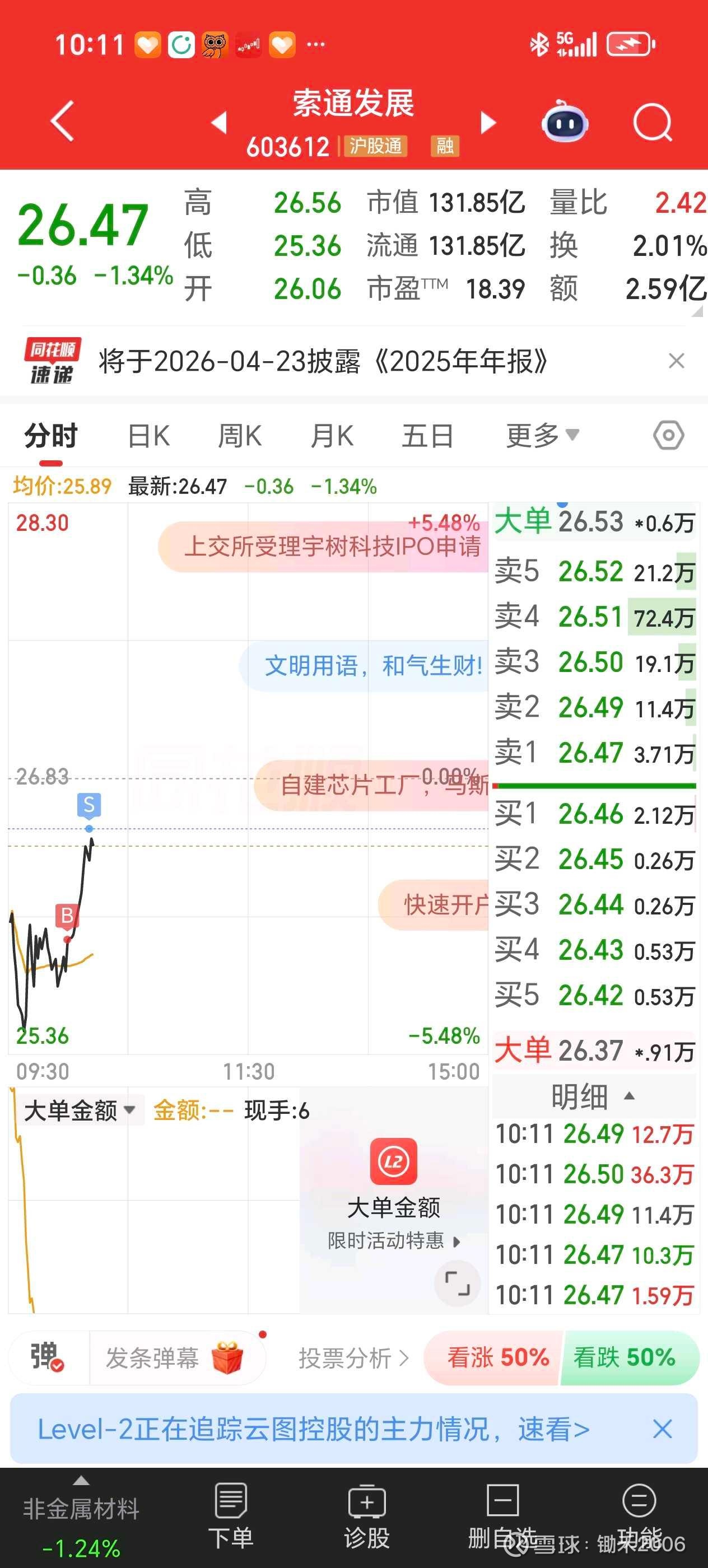 今天索通发展暴跌,持有的朋友都应该受到了重仓,最低的时候跌幅9.28%,一度接近跌停,股价打到28.04,而25年9月8日那天收盘价28.73,和今天的收盘价差不多。等于是现在的股价和半年的今天差不多,整整半年,坐了个过山车。