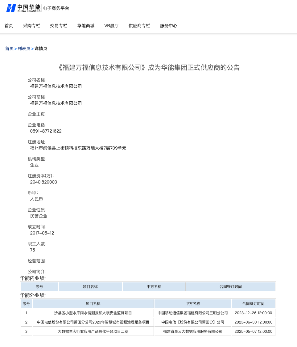 2月11日,华能集团电子商务平台发布公告,南威软件(603636)集团旗下福建万福信息技术有限公司(以下简称“万福信息”)经过严格的审核与综合评估,正式成为华能集团供应商。这是万福信息在AIoT算法技术领域多年深耕的重要突破,展现出技术实力与服务能力获能源领域中央骨干企业的权威认可,也标志着公司的技术成果从智慧水利、生态环保等领域,正式迈入能源产业数字化建设的新赛道。