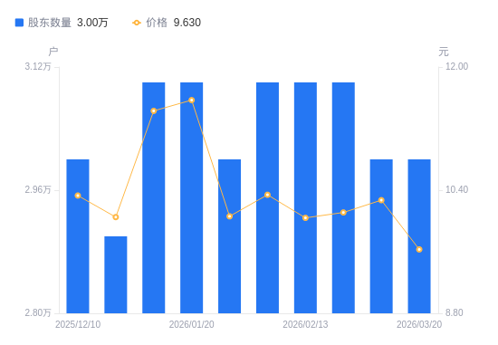 近一年(2025年3月31日至2026年2月27日),苏州科达A股股东户数从5.45万户,减低至3.1万户,降幅43.11%,区间股价上涨41.80%。