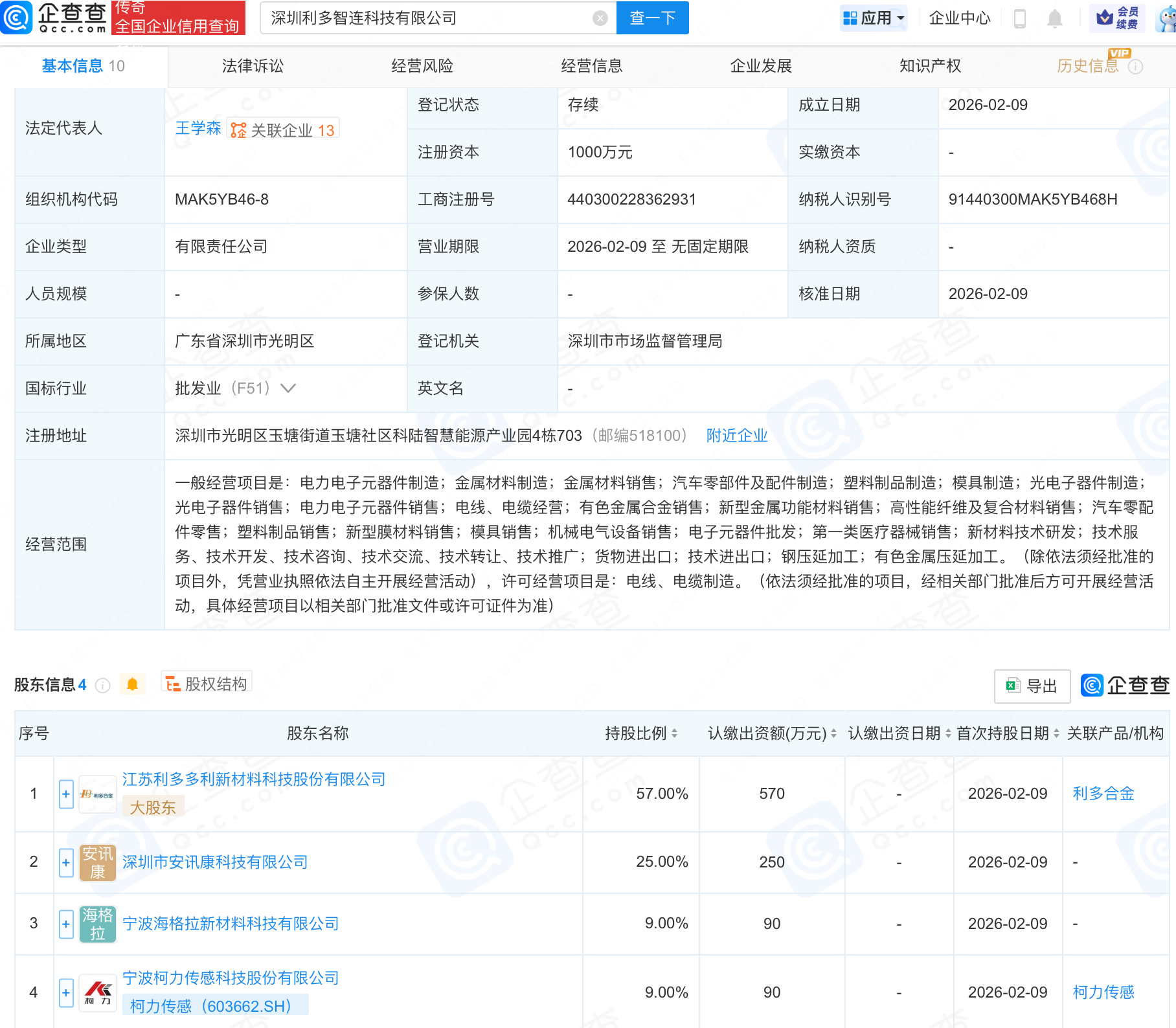 企查查APP显示,近日,深圳利多智连科技有限公司成立,注册资本1000万元,经营范围包含:有色金属合金销售;新型金属功能材料销售;高性能纤维及复合材料销售;汽车零配件零售等。企查查股权穿透显示,该公司由柯力传感(603662)(603662.SH)等共同持股。