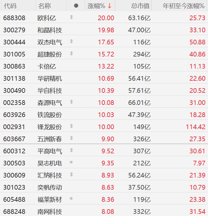 格隆汇1月19日|A股市场机器人概念股走强,截至半日收盘,欧科亿、和晶科技20CM涨停,双杰电气涨超17%,超捷股份涨超15%,卡倍亿涨超13%,华研精机、华自科技涨超10%,森源电气、铁流股份、锋龙股份10CM涨停,五洲新春、平高电气、昊志机电逼近涨停。