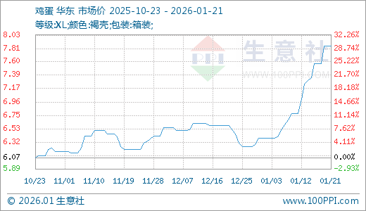 据生意社监测,鸡蛋01月21日最新价格7.85元/公斤,最近5天上涨3.70%,10天上涨15.78%,15天上涨20.21%,20天上涨23.04%,60天上涨26.61%。