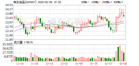 有友食品报收13.56元,日涨幅-2.38%,换手率4.18%,周涨幅10.15%,列第一,今年以来涨幅10.69%。