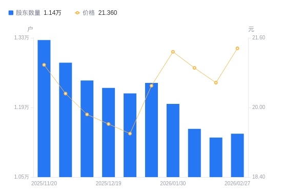 近一年(2025年2月28日至2026年2月27日),东方环宇A股股东户数从1.15万户,减低至1.14万户,降幅1.04%,区间股价上涨28.37%。