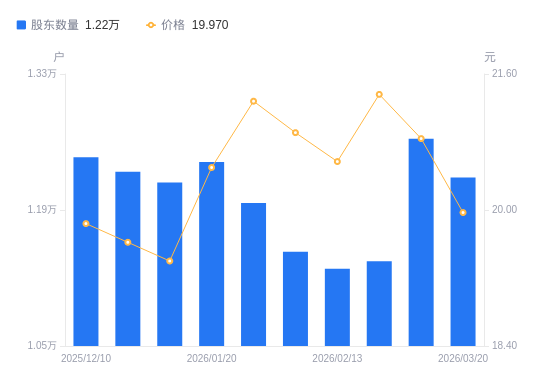 近一年(2025年3月20日至2026年3月20日),东方环宇A股股东户数从1.2万户,增加至1.22万户,增幅2.24%,区间股价上涨12.32%。