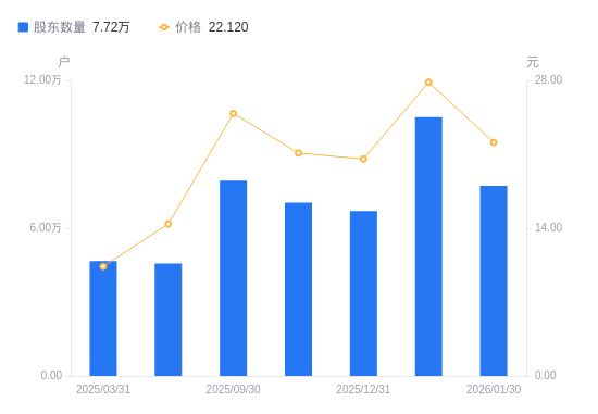 2月3日消息,数据显示,截至2026年1月30日,塞力医疗A股股东总户数为7.72万户,较上期(2026年1月10日)减少2.79万户,降幅26.52%。公司最新A股总股本为2.1亿股,其中流通A股2.1亿股,户均持有流通A股数量为2722.5股,较上期增加722.12股,增幅36.10%;户均持流通A股市值6.02万元,较上期增加4551.15元,增幅8.18%。
