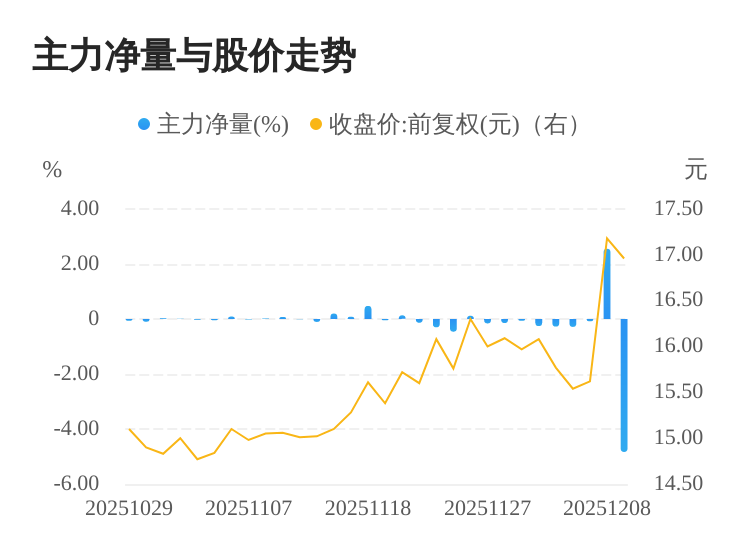 该股今日主力净量为负,且值较大,表明主力大幅流出,主动卖出明显多于主动买入。与此同时,今日换手率较高,主力抛售的嫌疑较大。投顾建议:投资者短期宜合理控制仓位,谨慎为佳。