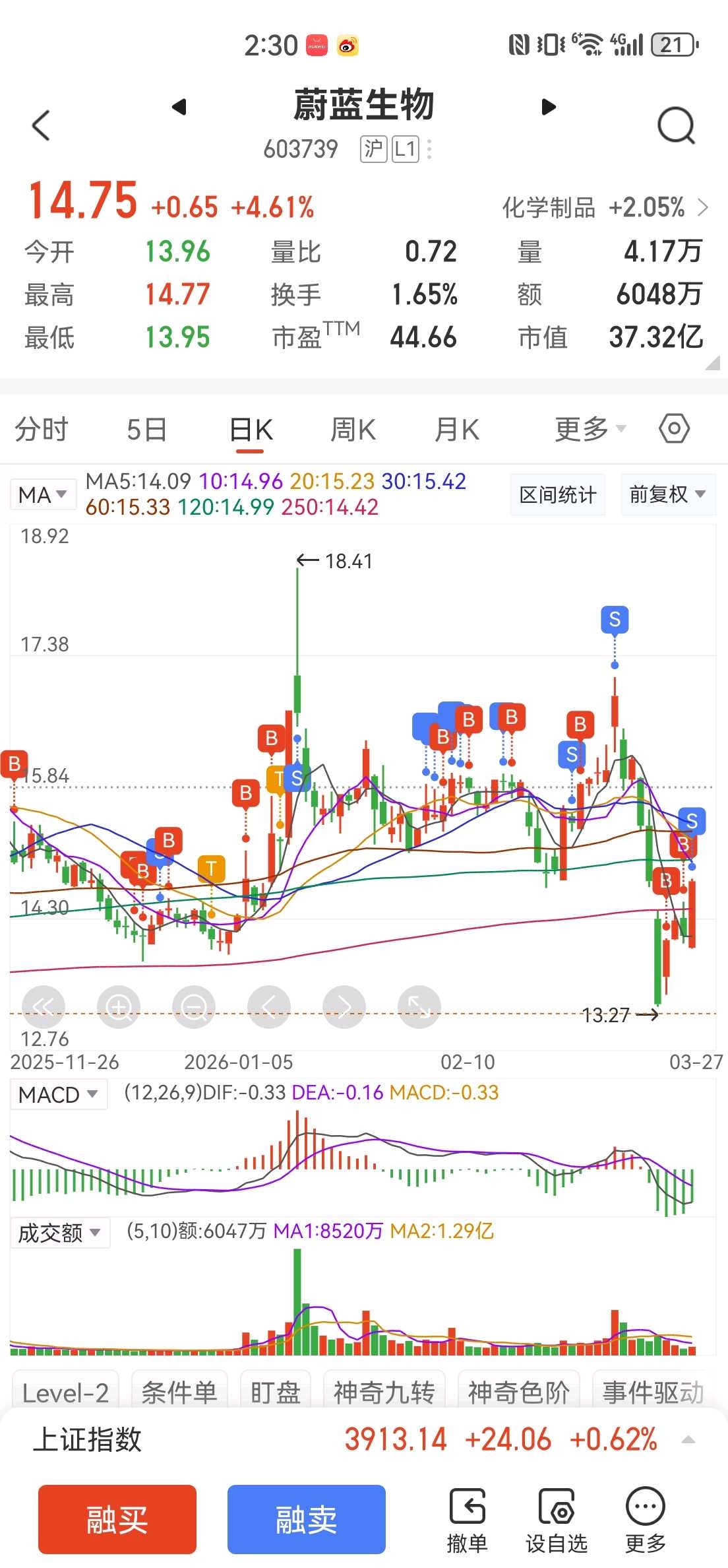 昨晚做梦蔚蓝生物这周涨到19.5了