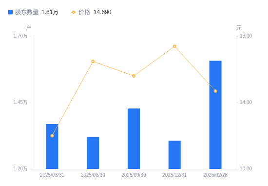 3月27日消息,数据显示,截至2025年12月31日,秦安股份A股股东总户数为1.31万户,较上期(2025年9月30日)减少1213户,降幅8.50%。公司最新A股总股本为4.39亿股,其中流通A股4.39亿股,户均持有流通A股数量为3.36万股,较上期增加2854.56股,增幅9.29%;户均持流通A股市值58.42万元,较上期增加10.47万元,增幅21.83%。