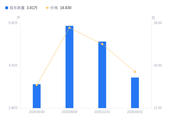 近一年(2025年3月31日至2026年3月31日),中马传动A股股东户数从3.43万户,增加至3.81万户,增幅11.02%,区间股价上涨26.12%。