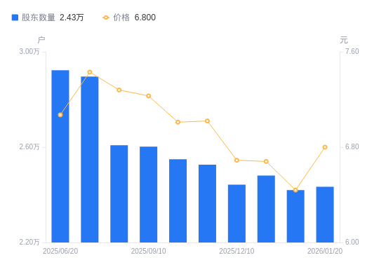 近一年(2025年1月20日至2026年1月20日),威龙股份A股股东户数从3.54万户,减低至2.43万户,降幅31.26%,区间股价下跌6.73%。