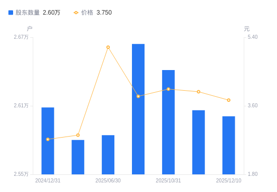 近一年(2024年12月31日至2025年12月10日),曲美家居A股股东户数从2.61万户,减低至2.6万户,降幅0.30%,区间股价上涨34.41%。