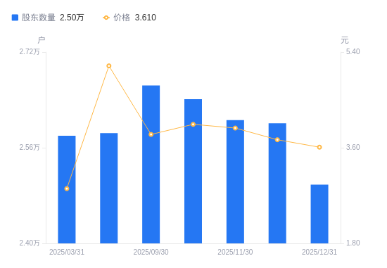 近一年(2024年12月31日至2025年12月31日),曲美家居A股股东户数从2.61万户,减低至2.5万户,降幅4.23%,区间股价上涨29.39%。