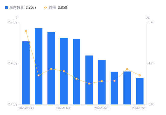 近一年(2025年3月31日至2026年2月13日),曲美家居A股股东户数从2.58万户,减低至2.36万户,降幅8.47%,区间股价上涨32.76%。
