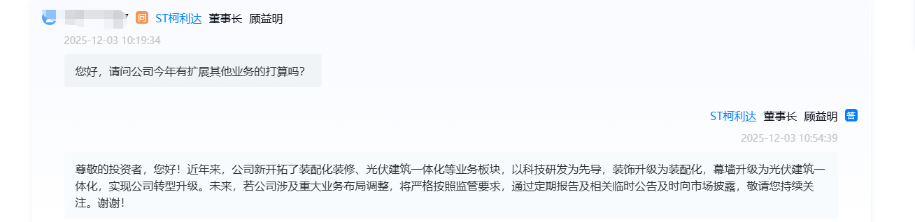 乐居财经 李兰 12月3日,ST柯利达(维权)举行2025年第三季度业绩说明会,董事长顾益明、总经理鲁崇明、副总经理兼董事会秘书何利民等出席。