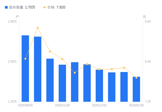 近一年(2025年2月28日至2026年1月30日),安正时尚A股股东户数从1.52万户,增加至1.7万户,增幅11.91%,区间股价上涨44.50%。