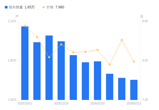 2月26日消息,数据显示,截至2026年2月13日,安正时尚A股股东总户数为1.65万户,较上期(2026年2月10日)减少145户,降幅0.87%。公司最新A股总股本为3.89亿股,其中流通A股3.89亿股,户均持有流通A股数量为2.35万股,较上期增加204.53股,增幅0.88%;户均持流通A股市值18.78万元,较上期减少8630.16元,降幅4.39%。