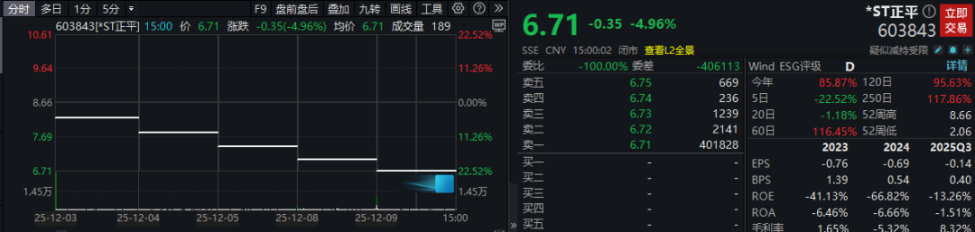 12月9日,*ST正平(603843)(603843)股价再次上演“一字”跌停,这已是该股股价自12月3日复牌以来第5个“一字”跌停。