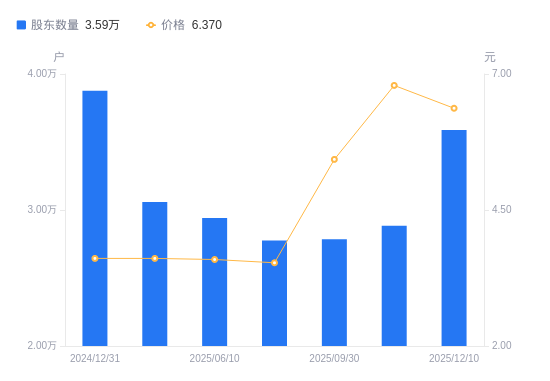 12月11日消息,数据显示,截至2025年12月10日,*ST正平A股股东总户数为3.59万户,较上期(2025年10月31日)增加7040户,增幅24.40%。公司最新A股总股本为7亿股,其中流通A股7亿股,户均持有流通A股数量为1.95万股,较上期减少4757.72股,降幅19.62%;户均持流通A股市值12.42万元,较上期减少4.05万元,降幅24.59%。