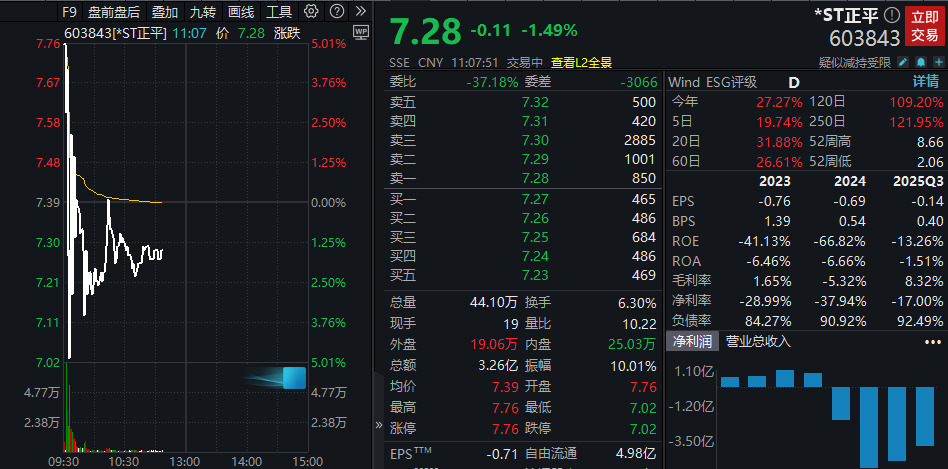 拉长时间维度来看,*ST正平股价多次在连续涨停与连续跌停之间快速切换。数据显示,该股自2025年9月以来累计涨逾170%,区间振幅超过200%。