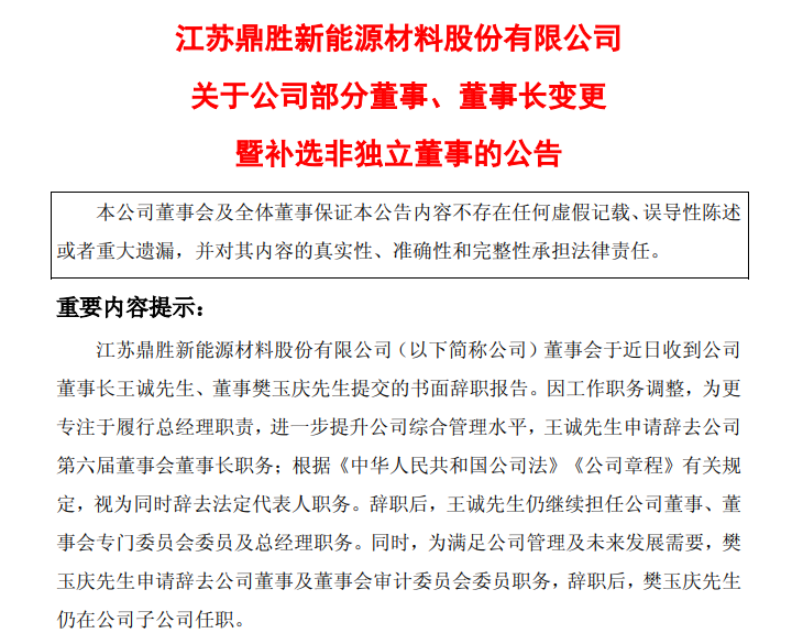 近日,锂电材料企业鼎胜新材公告,董事会近日收到董事长王诚先生、董事樊玉庆先生提交的书面辞职报告。