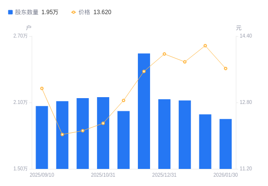 近一年(2025年2月28日至2026年1月30日),元祖股份A股股东户数从2.07万户,减低至1.95万户,降幅5.81%,区间股价上涨7.84%。