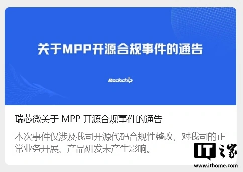 IT之家 2 月 27 日消息,瑞芯微(603893)电子股份有限公司今日(2 月 27 日)发布公告,就 MPP 开源合规事件致歉。