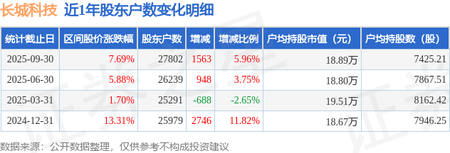 从股价来看,2025年6月30日至2025年9月30日,长城科技区间涨幅为7.69%,在此期间股东户数增加1563.0户,增幅为5.96%。