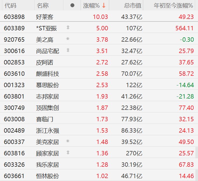 格隆汇12月2日|A股家具板块普涨,其中,好莱客10CM涨停,*ST亚振涨5%涨停,美之高、尚品宅配涨超3%,皮阿诺、麒盛科技、慕思股份涨超2%。