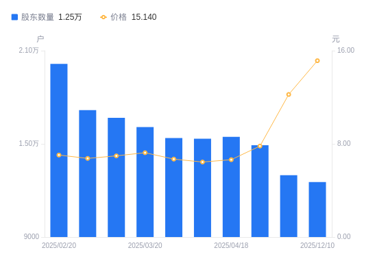 近一年(2024年12月10日至2025年12月10日),中持股份A股股东户数从1.58万户,减低至1.25万户,降幅20.56%,区间股价上涨104.87%。