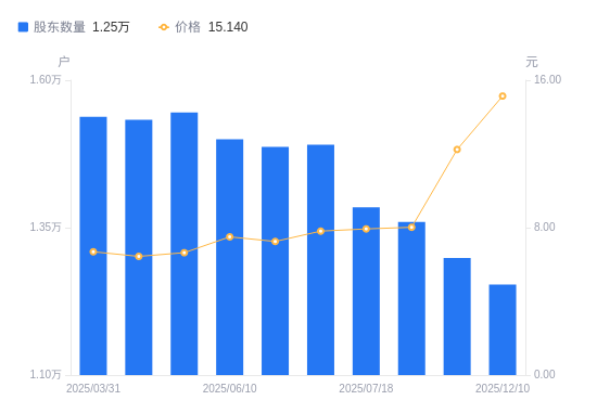 12月25日消息,数据显示,截至2025年6月10日,中持股份A股股东总户数为1.5万户,较上期(2025年4月18日)减少454户,降幅2.94%。公司最新A股总股本为2.55亿股,其中流通A股2.55亿股,户均持有流通A股数量为1.7万股,较上期增加500.04股,增幅3.03%;户均持流通A股市值12.77万元,较上期增加1.8万元,增幅16.37%。