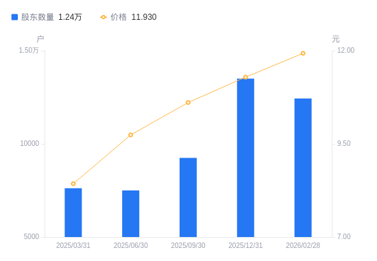 近一年(2025年2月28日至2026年2月28日),建发合诚A股股东户数从7299户,增加至1.24万户,增幅70.41%,区间股价上涨34.35%。