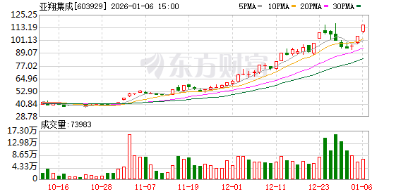 人民财讯1月6日电,二连板亚翔集成(603929)1月6日披露股票交易异动公告称,公司股价短期上涨幅度较大,已偏离上市公司基本面,未来存在较大下跌风险。公司股票价格于2025年12月31日至2026年1月6日期间累计上涨24.26%,自2025年11月以来累计上涨172.16%。当前可能存在市场情绪过热、非理性炒作风险。经公司自查,并书面征询控股股东及实际控制人,截至本公告披露日,确认不存在应披露而未披露的重大信息。