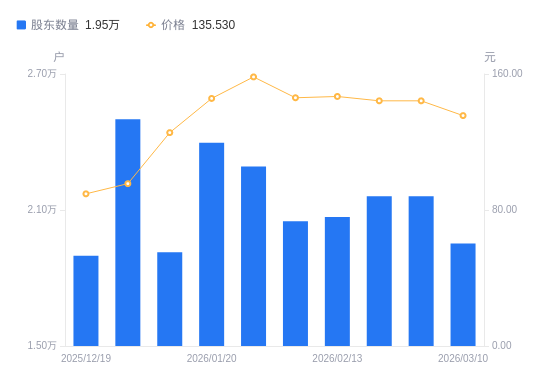 3月13日消息,数据显示,截至2026年3月10日,亚翔集成A股股东总户数为1.95万户,较上期(2026年2月28日)减少2085户,降幅9.65%。公司最新A股总股本为2.13亿股,其中流通A股2.13亿股,户均持有流通A股数量为1.09万股,较上期增加1054.32股,增幅10.68%;户均持流通A股市值148.1万元,较上期增加5.71万元,增幅4.01%。