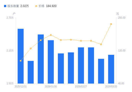 3月25日消息,数据显示,截至2026年3月20日,亚翔集成A股股东总户数为2.02万户,较上期(2026年3月10日)增加725户,增幅3.71%。公司最新A股总股本为2.13亿股,其中流通A股2.13亿股,户均持有流通A股数量为1.05万股,较上期减少391.23股,降幅3.58%;户均持流通A股市值194.84万元,较上期增加46.74万元,增幅31.56%。