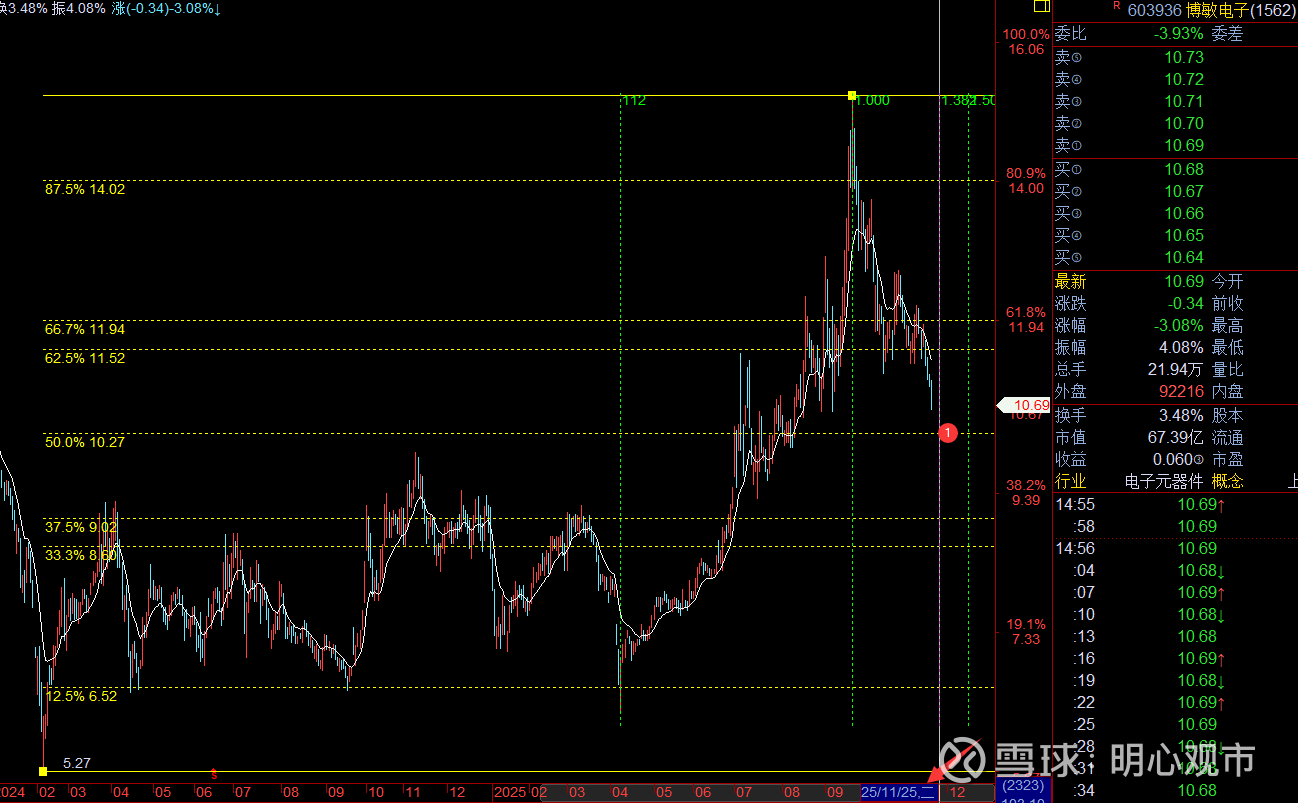 2.价格,百分比工具显示当前支撑6.39-6.27,上方短压6.89、重点看7.24-7.44,有突破去7.97的预期;后续能进一步拿下7.97,再看新空间;风控:6.06。
