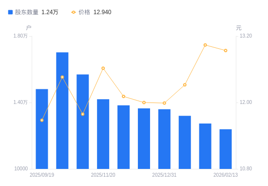 近一年(2025年2月20日至2026年2月13日),丽岛新材A股股东户数从1.22万户,增加至1.24万户,增幅1.55%,区间股价上涨44.26%。