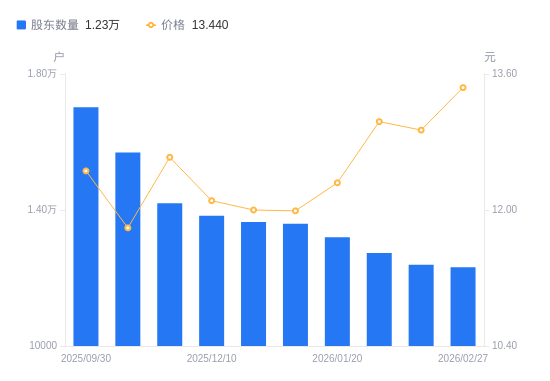 近一年(2025年2月28日至2026年2月27日),丽岛新材A股股东户数从1.32万户,减低至1.23万户,降幅6.35%,区间股价上涨48.02%。