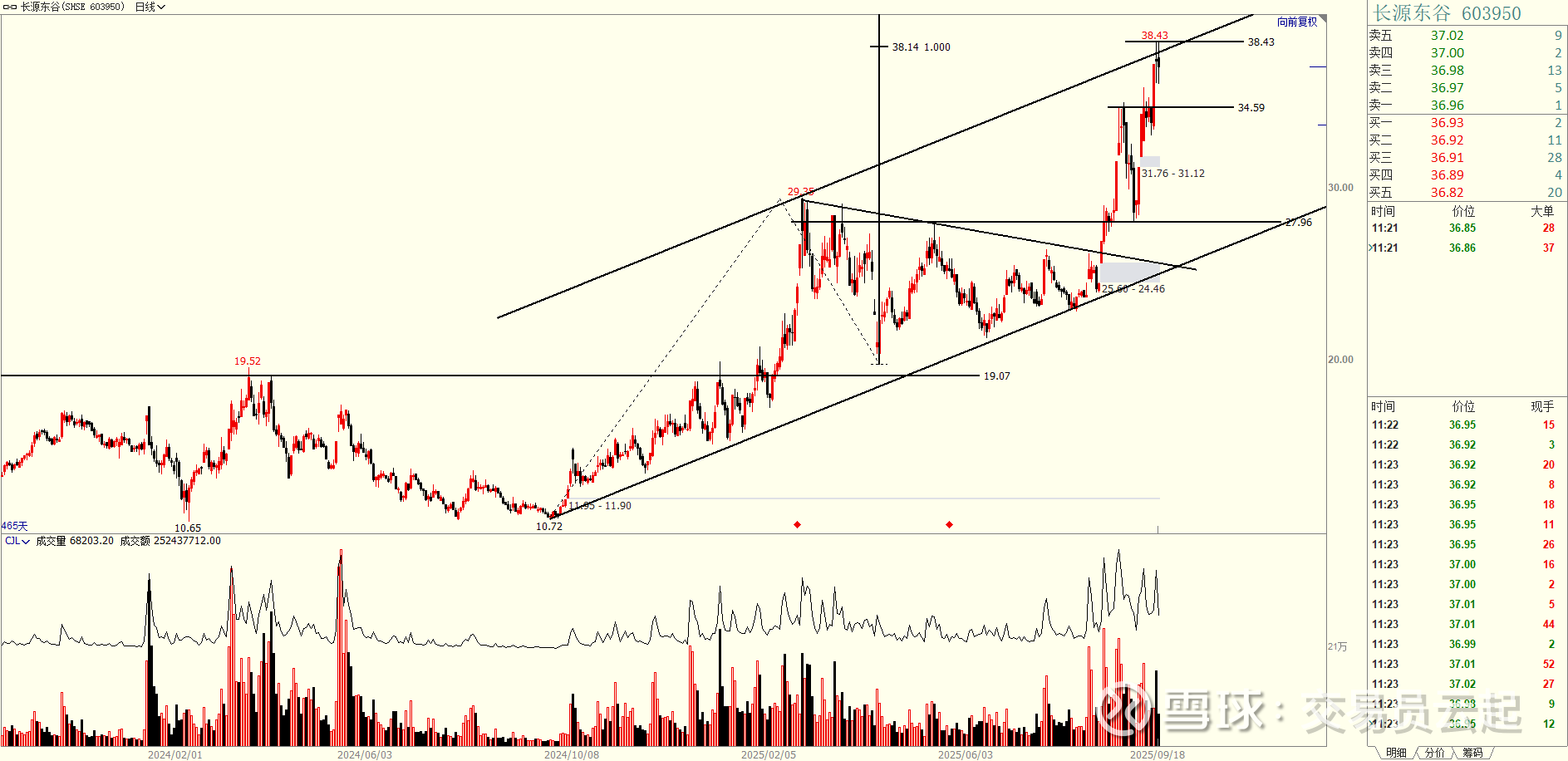 上涨到宽幅通道上轨区域,兑现了38.14的大波段目标位,注意减仓规避短期的回调风险,接下来暂时看34.6-38.4之间震荡,充分震荡2-3周,形成持续形态,才好进一步看涨;