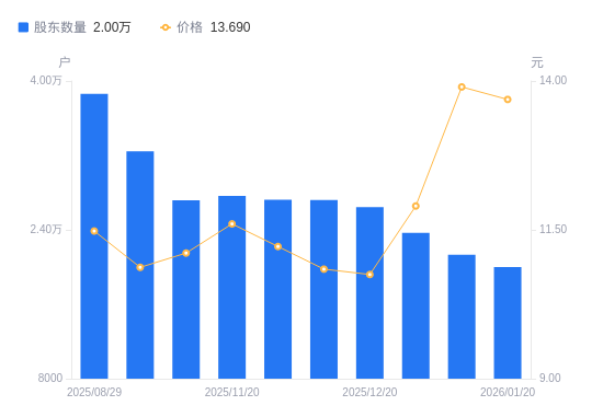 1月26日消息,数据显示,截至2026年1月20日,法兰泰克A股股东总户数为2万户,较上期(2026年1月10日)减少1318户,降幅6.18%。公司最新A股总股本为3.99亿股,其中流通A股3.98亿股,户均持有流通A股数量为1.99万股,较上期增加1229股,增幅6.59%;户均持流通A股市值27.22万元,较上期增加1.29万元,增幅4.98%。