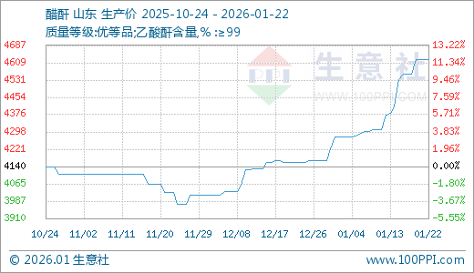 据生意社监测,醋酐01月22日最新价格4622.50元/吨,最近10天上涨5.66%,15天上涨7.50%,30天上涨11.05%,60天上涨14.84%。