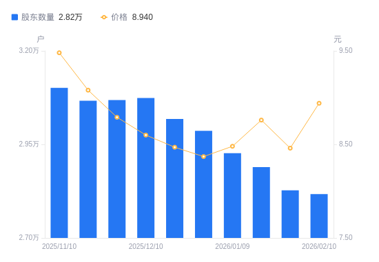 2月11日消息,数据显示,截至2026年2月10日,泉峰汽车A股股东总户数为2.82万户,较上期(2026年1月30日)减少100户,降幅0.35%。公司最新A股总股本为3.65亿股,其中流通A股3.4亿股,户均持有流通A股数量为1.21万股,较上期增加42.63股,增幅0.35%;户均持流通A股市值10.77万元,较上期增加6145.58元,增幅6.05%。