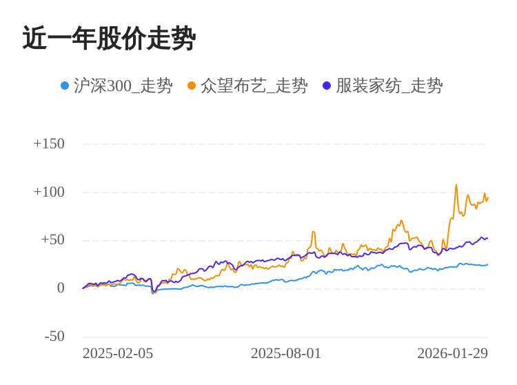 众望布艺股份有限公司的主营业务是中高档装饰面料及制品的研发、设计、生产与销售。公司的主要产品是装饰面料。公司多次获得年度纺织服装企业综合竞争力500强等荣誉称号,并在2024年获评浙江省“未来工厂”。