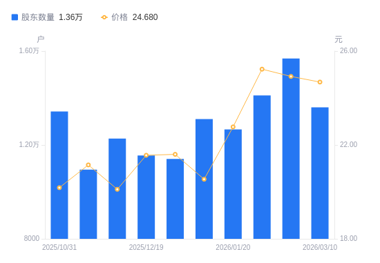 3月16日消息,数据显示,截至2026年3月10日,百龙创园A股股东总户数为1.36万户,较上期(2026年2月10日)减少2083户,降幅13.28%。公司最新A股总股本为4.2亿股,其中流通A股4.2亿股,户均持有流通A股数量为3.09万股,较上期增加4100.76股,增幅15.31%;户均持流通A股市值76.21万元,较上期增加9.48万元,增幅14.20%。