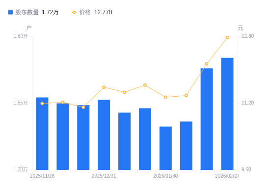 近一年(2025年3月31日至2026年2月27日),长华集团A股股东户数从1.68万户,增加至1.72万户,增幅2.39%,区间股价上涨9.78%。