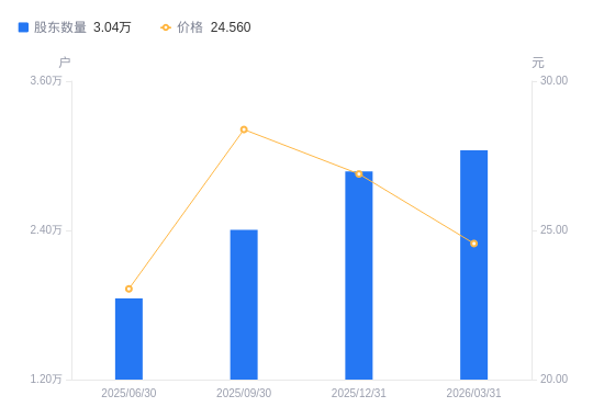 近一年(2025年3月31日至2026年3月31日),永和股份A股股东户数从1.86万户,增加至3.04万户,增幅63.49%,区间股价上涨8.19%。